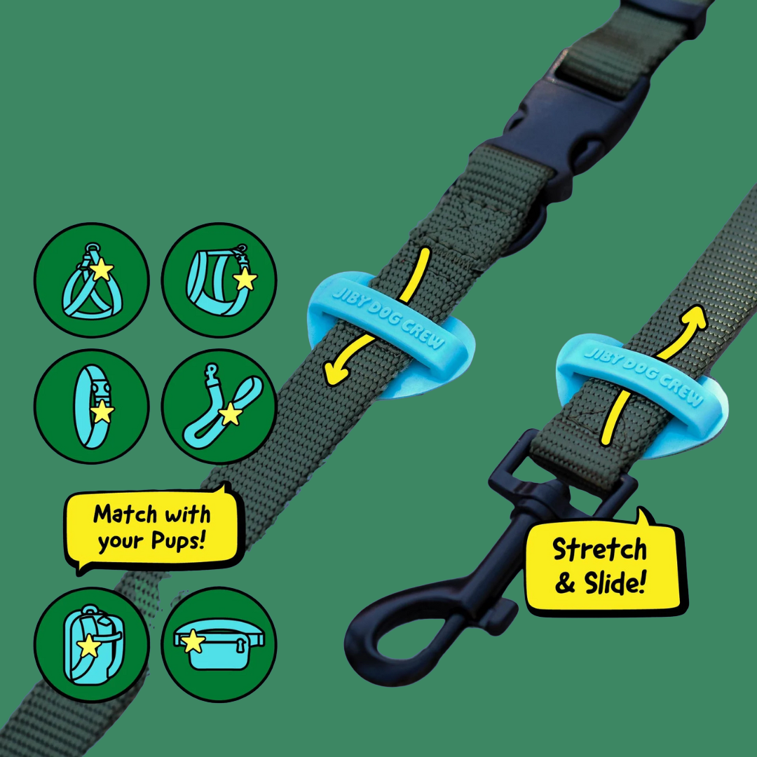 Jibys fit any strap widths up to 1.5 in. Stretch the elastic band over the buckle and slide into place. Jiby's are compatible with all different styles of gear including human bag straps, collars, harnesses, and leashes.