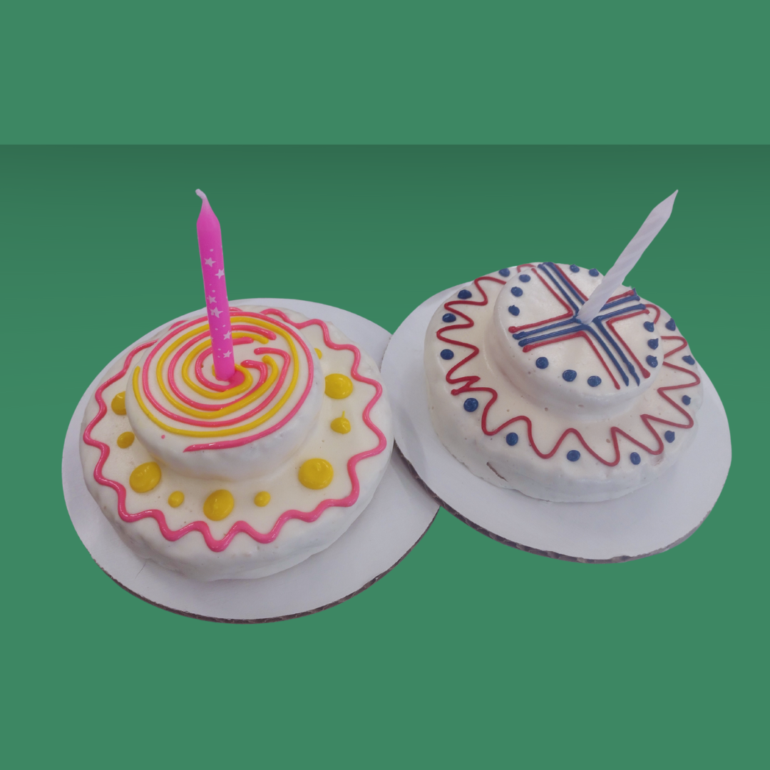 Celebrate in style with this adorable two tiered pup cake complete with a candle! Each cake is covered in yogurt-based icing and decorated with fun designs- and of course, every cake comes with a candle so you can get the cutest pics!