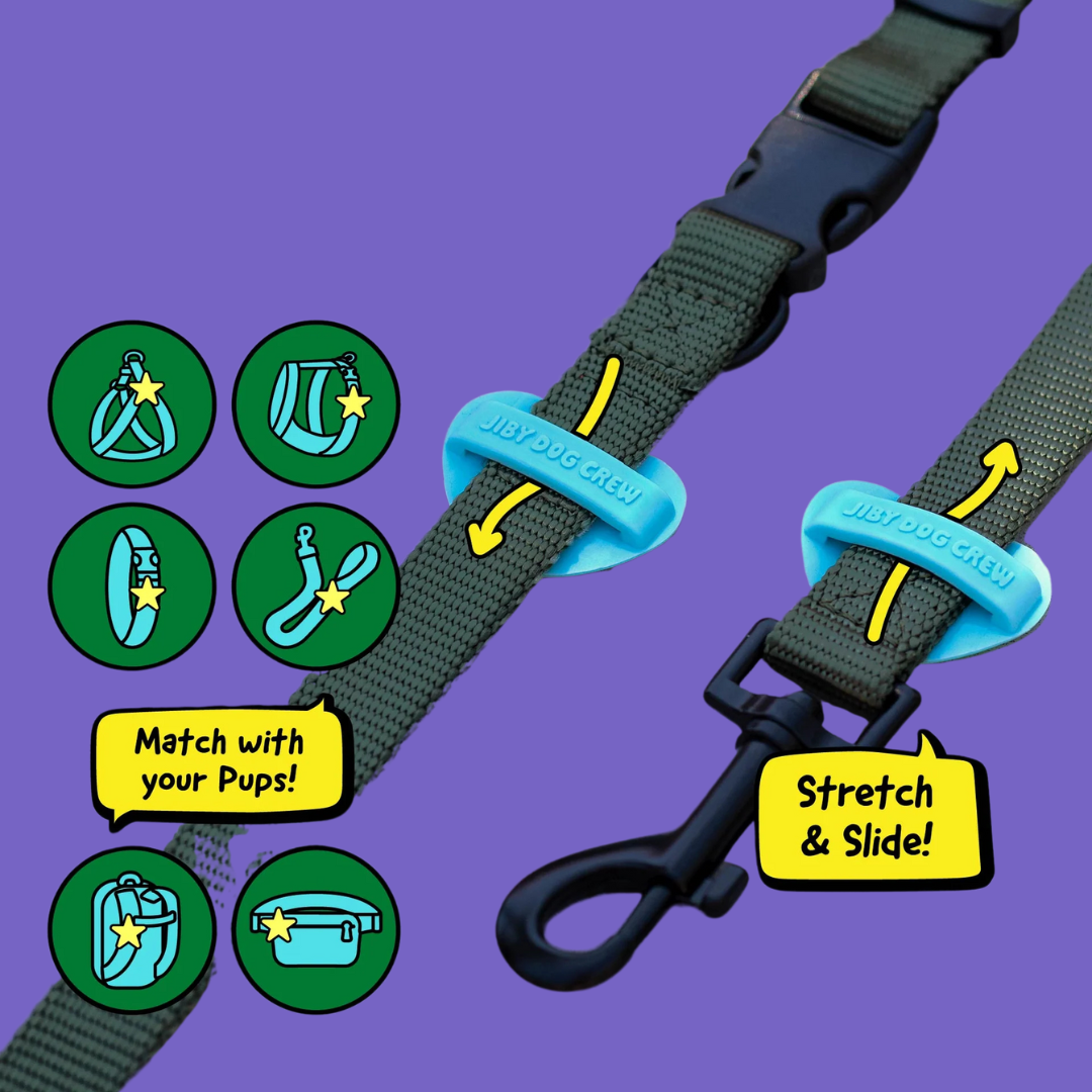 Jibys fit any strap widths up to 1.5 in. Stretch the elastic band over the buckle and slide into place. Jiby's are compatible with all different styles of gear including human bag straps, collars, harnesses, and leashes.