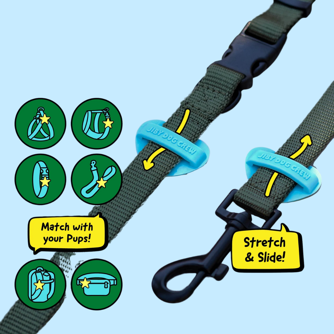 Jibys fit any strap widths up to 1.5 in. Stretch the elastic band over the buckle and slide into place. Jiby's are compatible with all different styles of gear including human bag straps, collars, harnesses, and leashes.