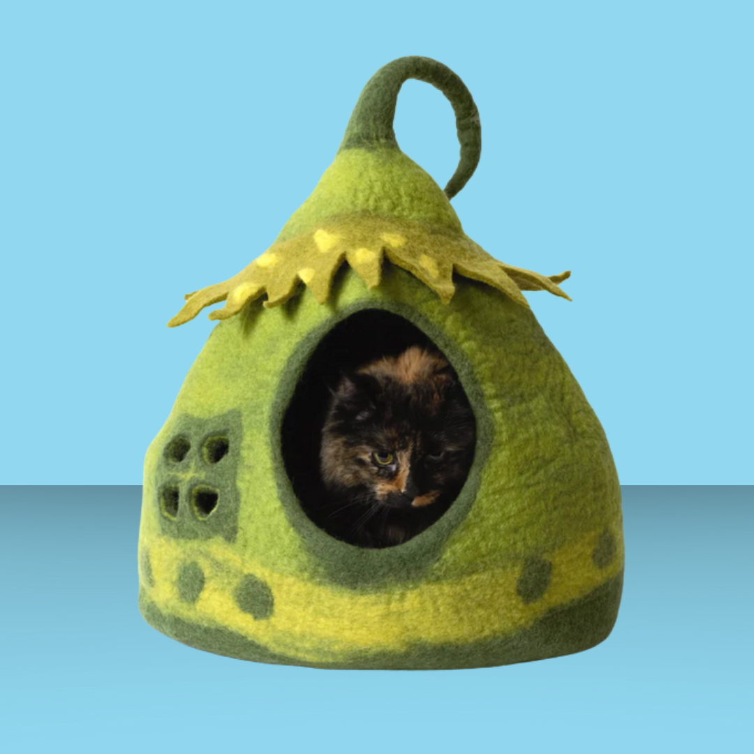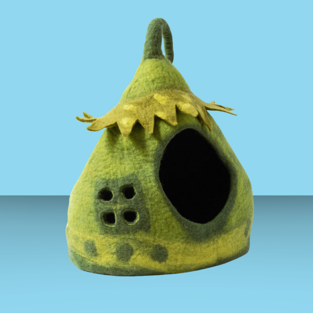 Poor fairies will be jealous of the warm, cozy house made just for your furbaby. This cozy cave is made of felted wool, and will be perfect for your fuzzy pal to snuggle up and dream of flitting through flowers. Approximately 16″ in diameter and 14″ high, our fairy house cave is great for pets up to 16 lbs.