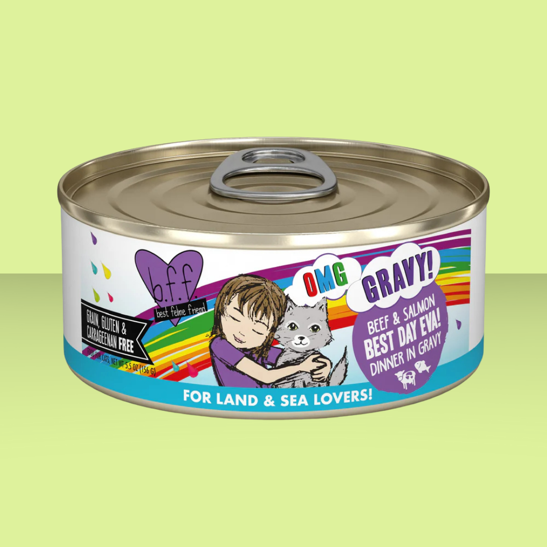Charm your BFF with a food full of all the gravy they want! Grass-fed beef, wild caught tuna, and salmon swirl in decadent gravy, perfect for the picky feline. All that gravy means extra hydration- and that's especially important, because cats tend towards dehydration.