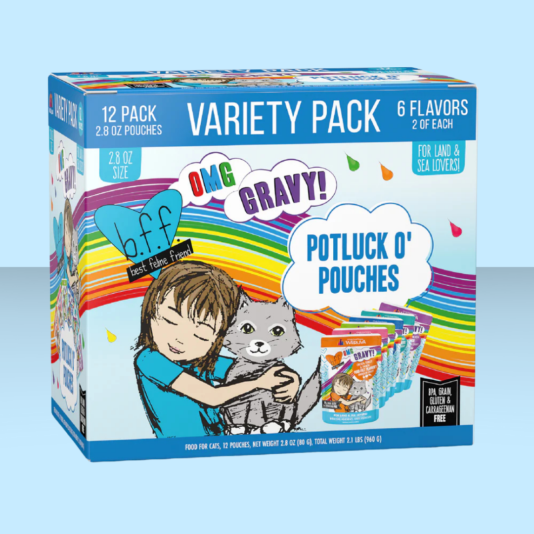 Make rotating flavors easy with the variety pack! 12 pouches with variety of 6 flavors will have your kitty guessing what's for dinner- and that means they won't get bored with mealtime. This pack contains 2 pouches each of the following flavors: Chicken, Turkey & Salmon Purr-fect Plannin'!, Duck & Salmon Date Nite!, Lamb & Tuna Shazaam!, Chicken & Shrimp Ciao Baby!, Chicken & Tuna Seeya Sooner! and Beef & Chicken Booya!