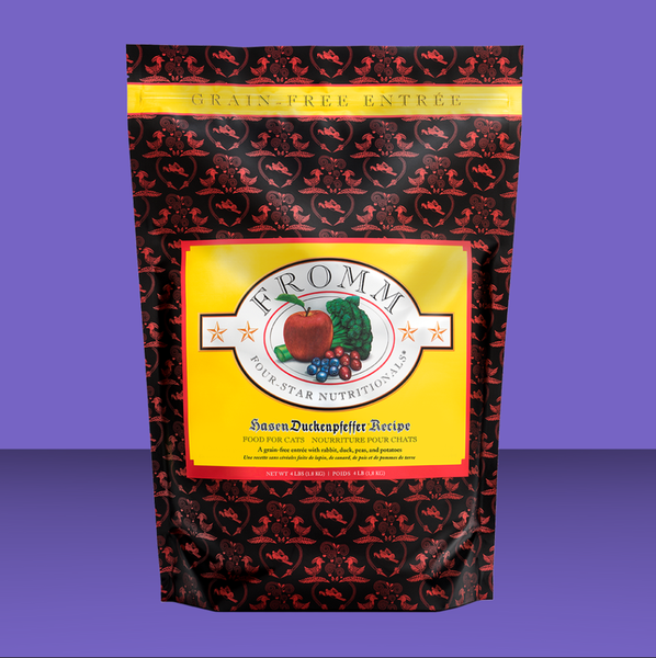 Treat your cat to the flavors of Germany with Fromm’s Hasen Duckenpfeffer recipe and they’ll be purring “Danke schön!” This gourmet, grain-free entrée features high-quality rabbit and duck, peas, and potatoes, providing essential amino acids and nutrients. Enhanced with nutrient-rich fruits and vegetables, it supports digestion, immunity, and metabolic health. Suitable for cats of all breeds and ages, from crazy kittens to seasoned seniors, this interchangeable Four-Star recipe adds variety and excitement to every mealtime.