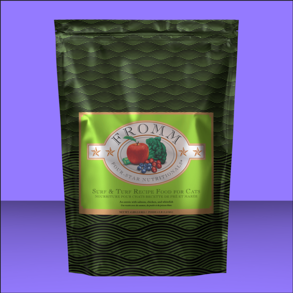 Dive into a feast fit for a feline king with Fromm’s dry Surf and Turf Recipe! This exquisite, grain-free blend of high-quality salmon, chicken, and whitefish delivers a taste sensation that your cat will adore. Packed with essential amino acids and nutrients, plus nutrient-rich fruits and vegetables, it supports digestion, immunity, and overall health. And added probiotics ensure smooth sailing for your cat's tummy, too!