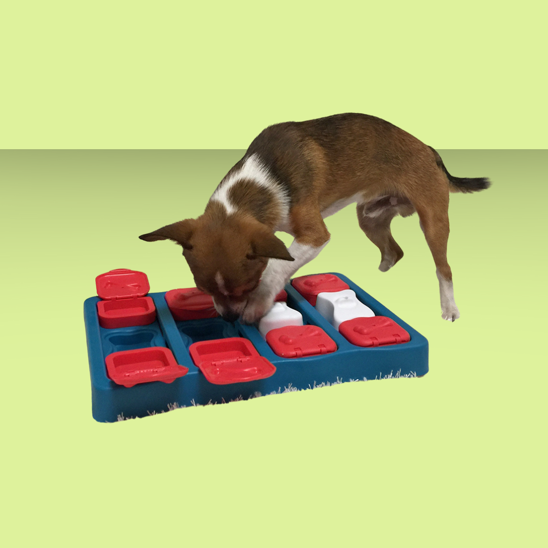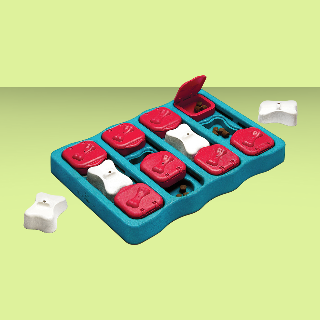 To play:  Place treats or kibble in compartments of base and sliding blocks. Cover middle compartments with the bones. The more covered compartments, the harder the puzzle will be! Let the games begin! Show your dog how the game works and encourage them to find the treats. Dogs are smarter than you think. Sometimes we just need to teach them! Leave some of the bones out and flip open the blocks to gain your pup's interest!
