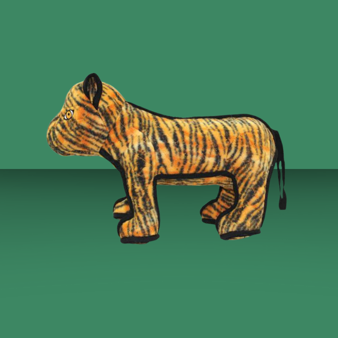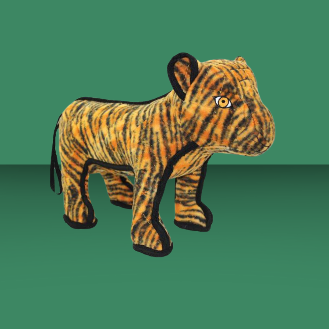 Around here, we all cheer for Tigers- and your dog will cheer especially loud when he gets his paws on this toy! This toy is made with rough play in mind, so there's 3 layers (innermost plastic, tough luggage fabric, and supersoft fleece) sewn into one layer, so it's not easy to peel apart. The seams are sewn with reinfoced webbing and double stitched! If playtime gets messy, you can machine wash and air dry your Tuffy toy.