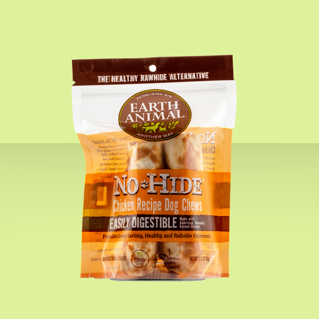 Dogs love to chew, but rawhide isn't very safe, often filled with chemicals and even glue! Earth Animal No-Hides are made with rice flour and agar-agar, then covered in tasty chicken- so they're extra flavorful! They soften as they're being chewed, and are fully digestible if your pup swallows any little bits. These chews are great for puppies and seniors, too!