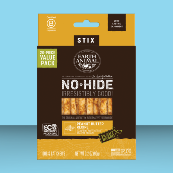 Dogs love to chew, but rawhide isn't very safe, often filled with chemicals and even glue! Earth Animal No-Hides are made with rice flour and agar-agar, then covered in tasty peanut butter- so they're extra flavorful! They soften as they're being chewed, and are fully digestible if your pup swallows any little bits. These chews are great for puppies and seniors, too!