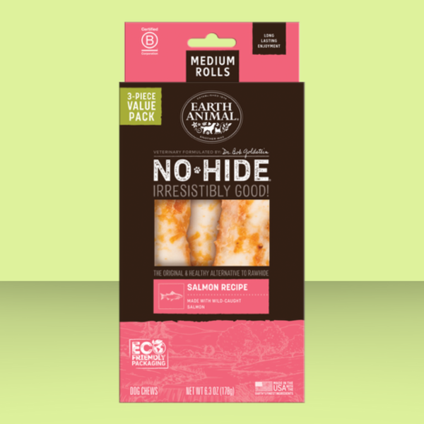 Dogs love to chew, but rawhide isn't very safe, often filled with chemicals and even glue! Earth Animal No-Hides are made with rice flour and agar-agar, then covered in tasty salmon- so they're extra flavorful! They soften as they're being chewed, and are fully digestible if your pup swallows any little bits. These chews are great for puppies and seniors, too!