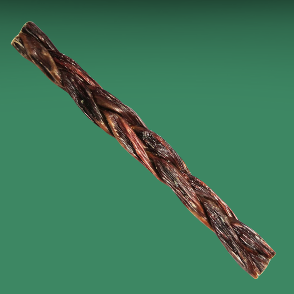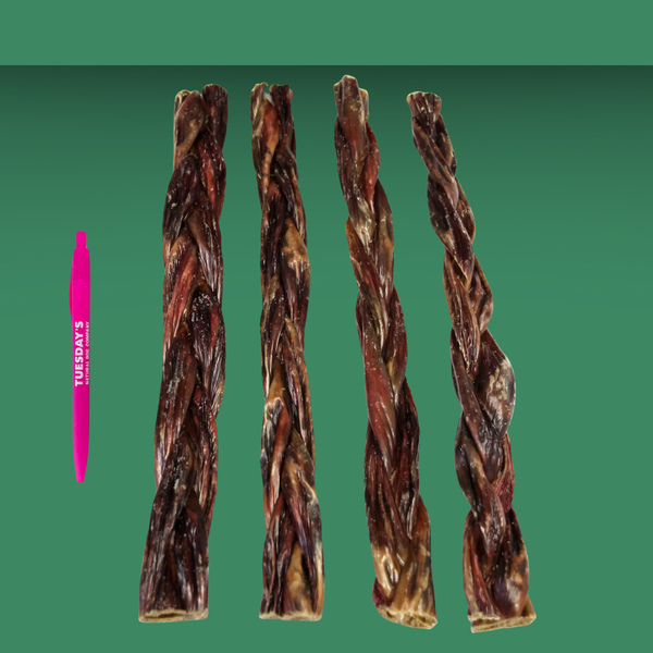 What's better than one gullet? Three, braided tightly together! Three beef esophagus is braided together and then allowed to dry, which lets it keep the shape- no glues involved! This high protein chew is a very palatable treat, and is easier to digest and softer than a bully stick.