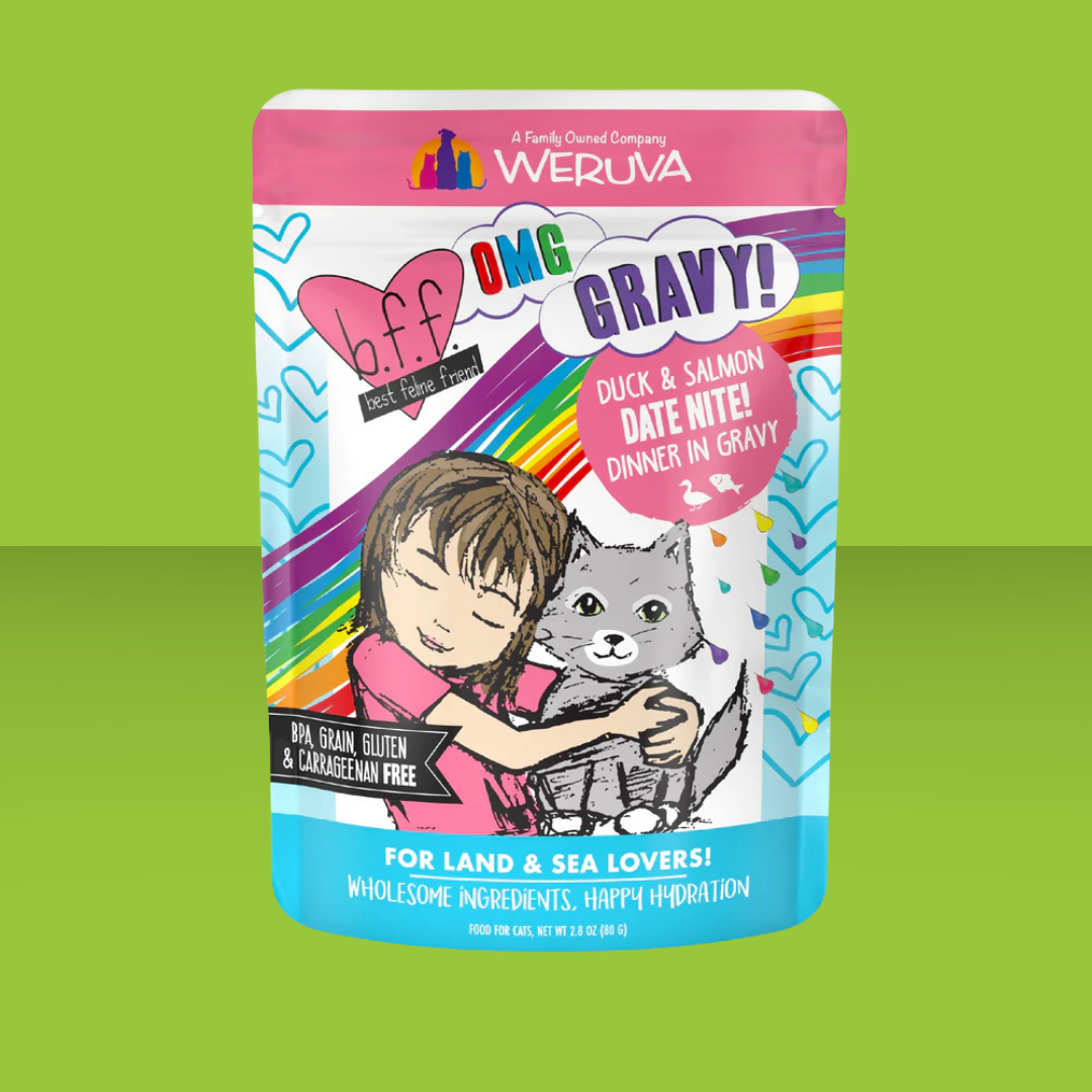 Give your cat a delicious Date Nite! Delicious cage-free duck and wild-caught salmon swirl in decadent gravy, perfect for the picky feline. All that gravy means extra hydration- and that's especially important, because cats tend towards dehydration.