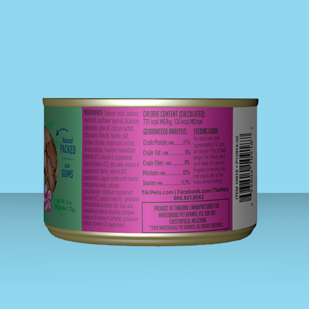 Seabass broth, seabass, mackerel, sunflower seed oil, dicalcium phosphate, olive oil, calcium lactate, potassium chloride, taurine, salt, choline chloride, magnesium sulfate, ferrous sulfate, thiamine mononitrate (vitamin B1), vitamin E supplement, niacin (vitamin B3), zinc oxide, vitamin A supplement, biotin, vitamin B12 supplement, copper amino acid chelate, manganous oxide, calcium pantothenate, riboflavin supplement (vitamin B2), sodium selenite, pyridoxine hydrochloride (vitamin B6), folic acid, menadione sodium bisulfite complex (source of vitamin K activity), potassium iodide, vitamin D3 supplement.