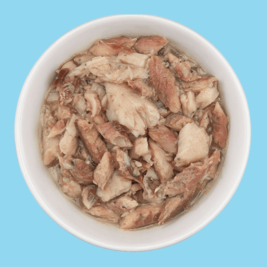 Flaked seabass with olive oil, rich in essential fatty acids, in a savory consommé that cats will lap up!