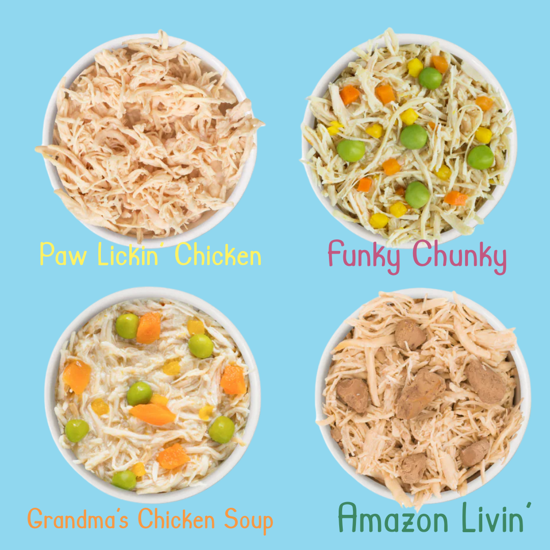 Feline fine, thanks for asking! And if that wasn't true, it's about to be. The joy you'll soon see ripple down kitty's spine as he sinks his teeth into his dinner, with home-cooked flavors he'll think you spent hours on. And when he's happy, you're happy. The Meow You Doin'? Variety Pack includes 3 each of: Paw Lickin' Chicken, Funky Chunky, Grandma's Chicken Soup, and Nine Liver