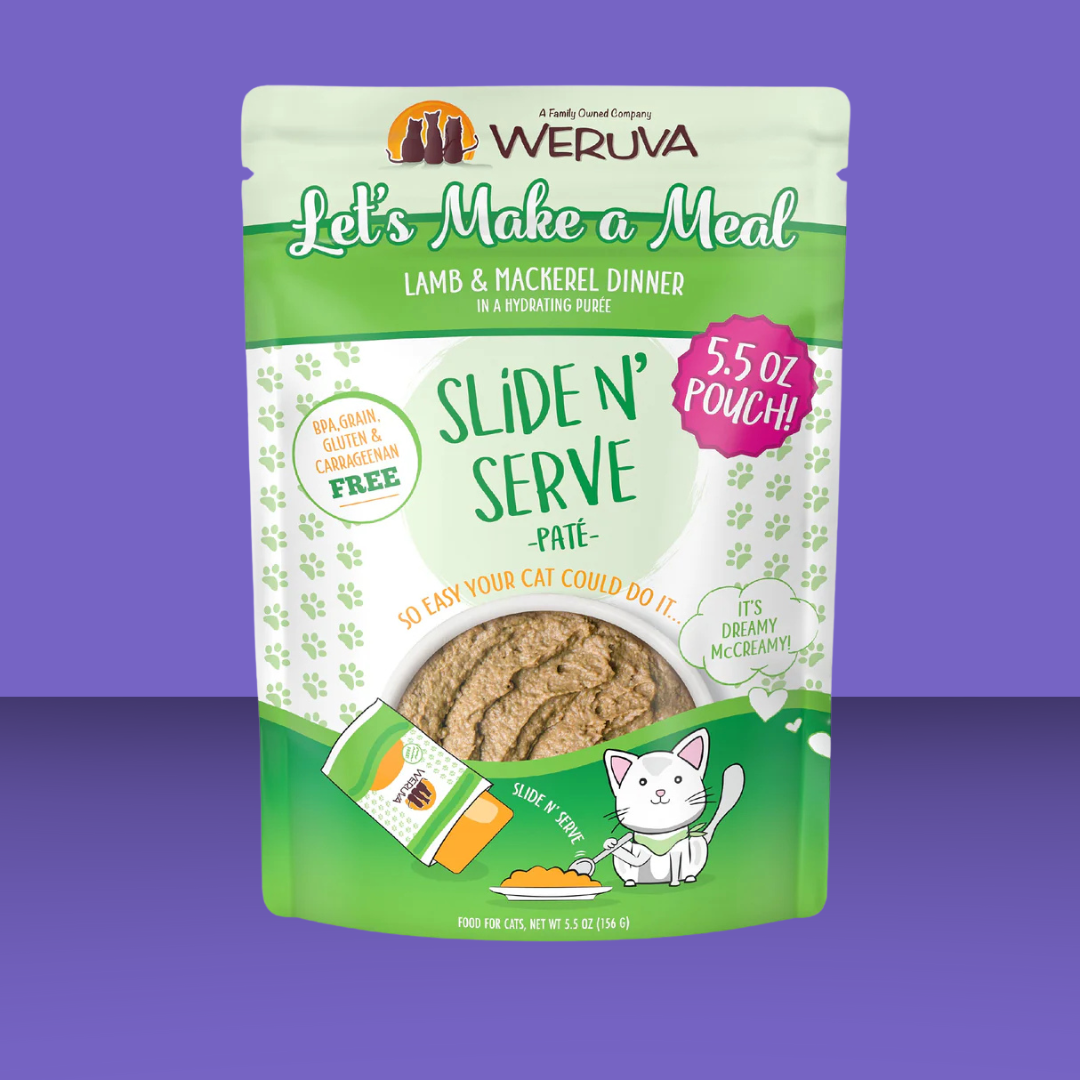 Cats can be picky about texture. For those felines that want their pates smoother than smooth, Slide N Serve is here! The pate is so smooth, yet firm enough to slide right out of the pouch in just one piece- with a little extra gravy for you to top it off with. Made with delicious grass-fed lamb and wild-caught mackerel, we know this dinner will have your cat licking their chops!