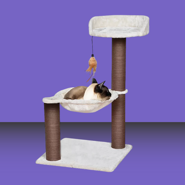Give your cat true nirvana with this cozy tree! The Nirvana cat tree combines a minimalist and modern design to fit any home décor, and soft cushions and hammock for any cat's snuggling needs. The dangly feather encourages play, and giving them a healthy place to scratch will keep your furniture safer.