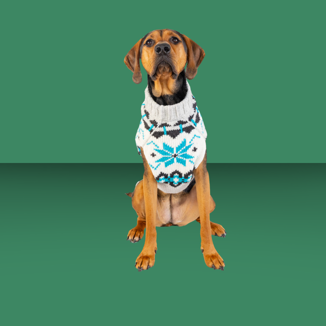 It may be chilly, but your dog will be cozy warm and looking cool! The Chilly Dog Frost Dog Sweater is hand knit made from 100% alpaca wool. This design was inspired icy blues and warm grays of the arctic. This uniquely designed pullover pet sweaters look great on both male and female dogs and are available in 6 sizes to fit every dog breed. The hearty wool not only keeps our furry friends warm but it has enough give to fit barrel chested hard to fit breeds, such as Pitbulls, Dobermans, Boxers and Bulldogs!
