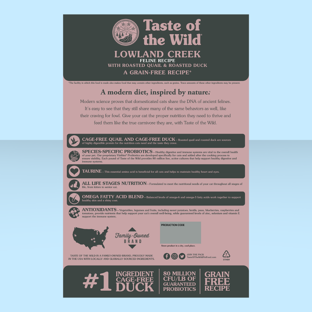 Cage-free quail and cage-free duck are both highly digestible proteins, making this recipe a good diet for the feline that craves fowl! A cat food for all life stages, Lowland Creek features species-specific probiotics for digestive and immune support, taurine to support a healthy heart and eyes, and antioxidants from vegetables, legumes and fruits for overall well-being. Let your kitty's taste buds fly with this bird-based diet!