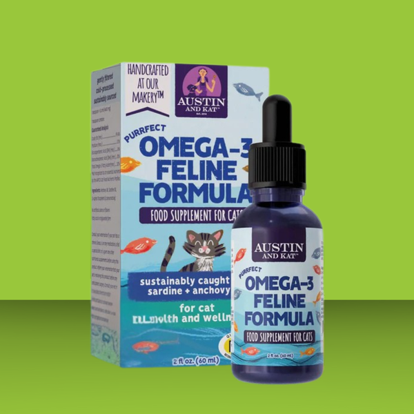 Cats are pretty independent, but they can't do everything on their own- for instance, they can't make essential fatty acids in their body. Help them out with Austin & Kat's Purrfect Feline Omega 3 oil! It's developed just for cats, with wild caught sardines and anchovies for the most Omega-3 punch in a few little drops. It will help your cat get the softest, shiniest coat, as well as helping protect joints, heart health, and boosting immunity. Talk about bang for your buck!