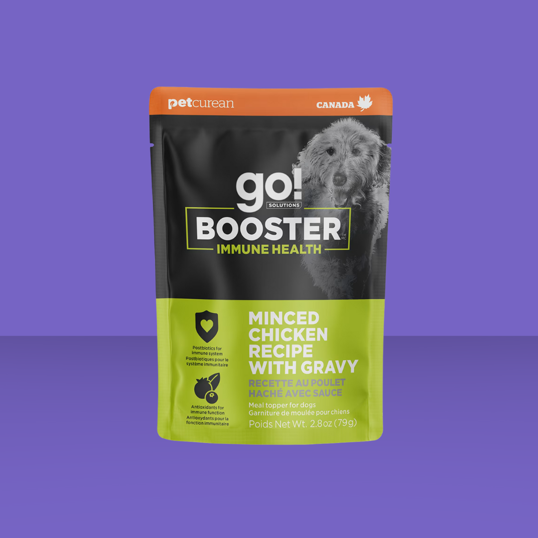 Support your dog's immunity with our Immune Health Minced Chicken with Gravy Booster dog food topper. Packed with antioxidant-rich ingredients like cranberries, blueberries, and raspberries, plus supplemental antioxidant-vitamin E, this delicious topper caters to your dog's tastebuds and their overall well-being. Use as a complement to their daily diet as a tasty way to support their hydration!