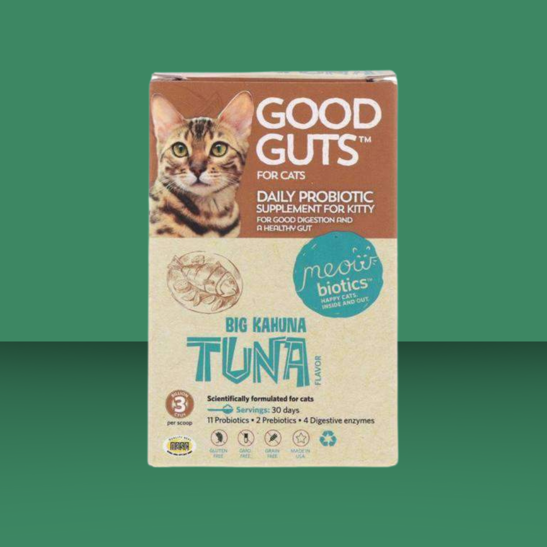 Good Guts For Cats is a daily probiotic supplement for your Meowser! It supports healthy immune function and gut regularity with 3 billion CFUs and creates a tranquil tummy through your kitty's natural elimination process. Good Guts is packed with 11 strains of probiotics, 2 prebiotics, and 5 plant-based digestive enzymes!