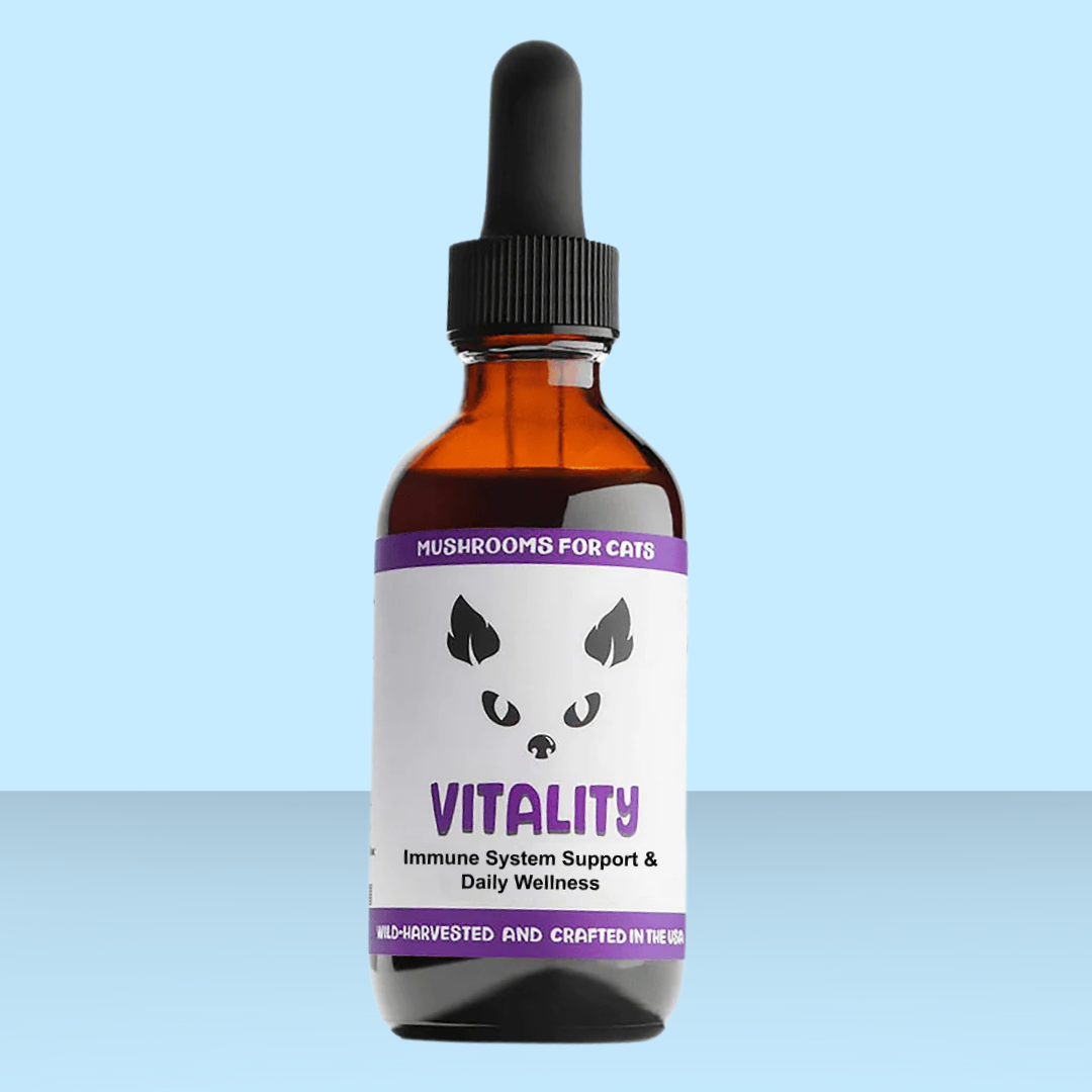 Vitality is a blend of mushroom extracts sourced from wild-harvested and naturally cultivated mushrooms grown outdoors in their native environments. This blend does it all, supporting cell turnover rate, boosting vitality in aging cats, supporting a balanced immune system, reducing inflammation, supporting liver health, and boosting mobility, and flexibility!