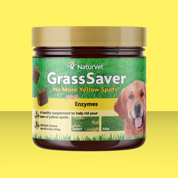 Veterinarian formulated NaturVet GrassSaver Soft Chews for Dogs contains healthy ingredients that help to diminish those yellow spots when given to your dog daily. DL-Methionine, an essential amino acid, combined with Yucca helps to maintain normal urine pH levels. The proprietary Vitamin B blend and cranberry help promote optimal urinary tract health and the normal function and health of the kidneys! To help out your yard, water yellow spots heavily for two weeks, then reseed those patches.