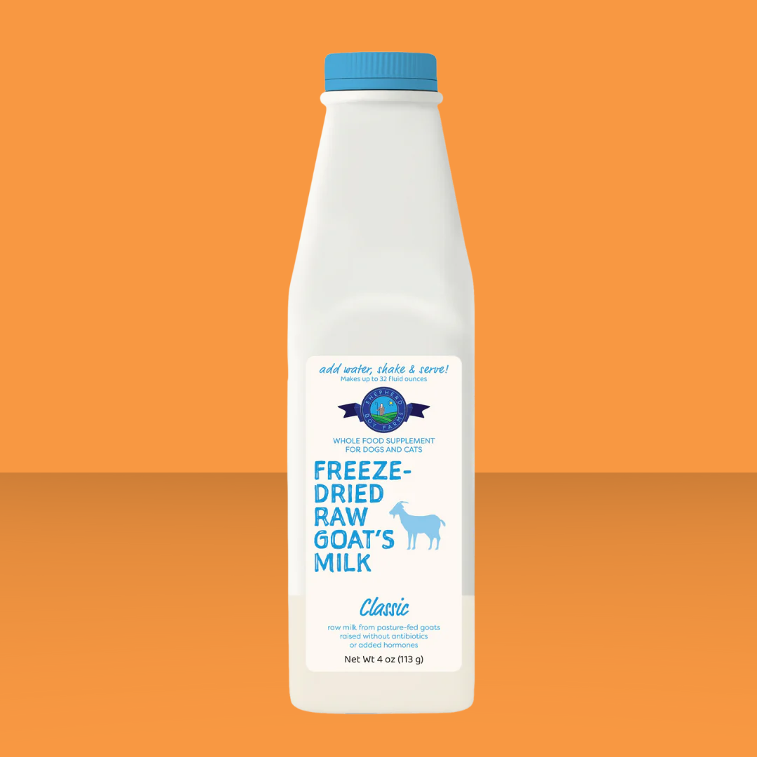 All the health benefits of goat's milk- but shelf stable! That's a dream come true for pet parents who need to travel, because with this freeze-dried goat's milk, there's no worry about needing refrigeration. Freeze-drying rather than traditional dehydration means that more natural vitamins and minerals remain in the goat's milk in an easily digestible state, as well as tasting as fresh as it was when it was freeze dried! That means retaining all those good probiotics for your pup's guts and immune system, plus calcium, taurine, Vitamins B6, B12, and A for your pet's bone strength, muscle health, and energy!