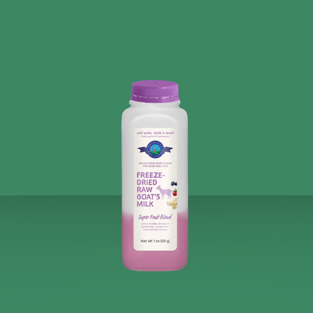 All the health benefits of goat's milk- but shelf stable! That's a dream come true for pet parents who need to travel, because with this freeze-dried goat's milk, there's no worry about needing refrigeration. Plus, this recipe is like a fruit smoothie for dogs, with so many anti-oxidant providing fruit like blueberries and cranberries! Freeze-drying rather than traditional dehydration means that more natural vitamins and minerals remain in the goat's milk in an easily digestible state, as well as tasting as fresh as it was when it was freeze dried. That means retaining all those good probiotics for your pup's guts and immune system, plus calcium, taurine, Vitamins B6, B12, and A for your pet's bone strength, muscle health, and energy!