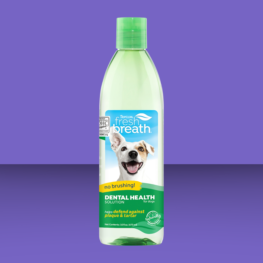 Cleaning your pet’s teeth is about more than just getting their pearly whites to sparkle — it’s an important step in their overall health and wellness. With TropiClean Fresh Breath Dental Health Solution, dogs can benefit from daily plaque and tartar defense. Easy-to-use Dental Health Solution gives your dog clean teeth and fresh breath-no brushing required!