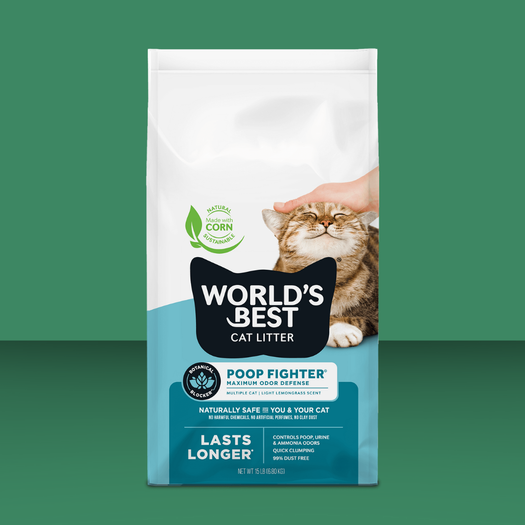 World's Best Poop Fighter formula is a naturally safe and sustainable tight-clumping litter with a soft texture that’s gentle on those precious paws. And because it’s made from whole-kernel corn, this formula lasts 2X longer than the leading U.S. brand. No harmful chemicals, no artificial perfumes, and no clay dust. That’s the power of corn! Even better, with the power of their Botanical Blocker, odors are blocked and neutralized before they have a chance to escape the box- instead, you'll get a light, fresh lemongrass scent!