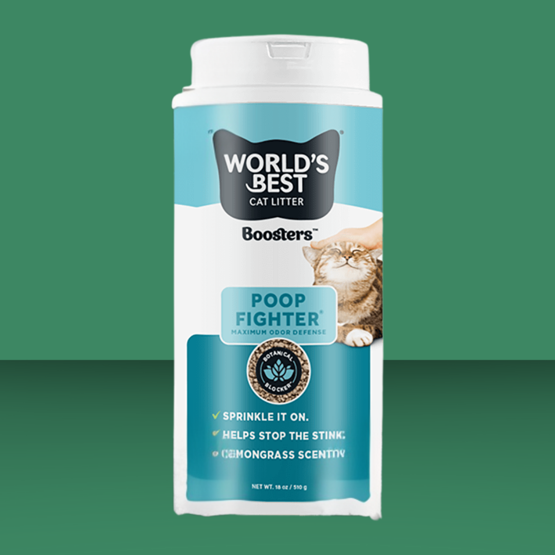 World’s Best Cat Litter Boosters litter additives solve the litter box’s biggest problems with a simple sprinkle. Put poop stink in its place and keep it there before it leaves the litter box. In fact, all you'll have to smell is a light, fresh lemongrass scent! Such an easy way to solve cat owner's olfactory annoyances, right?