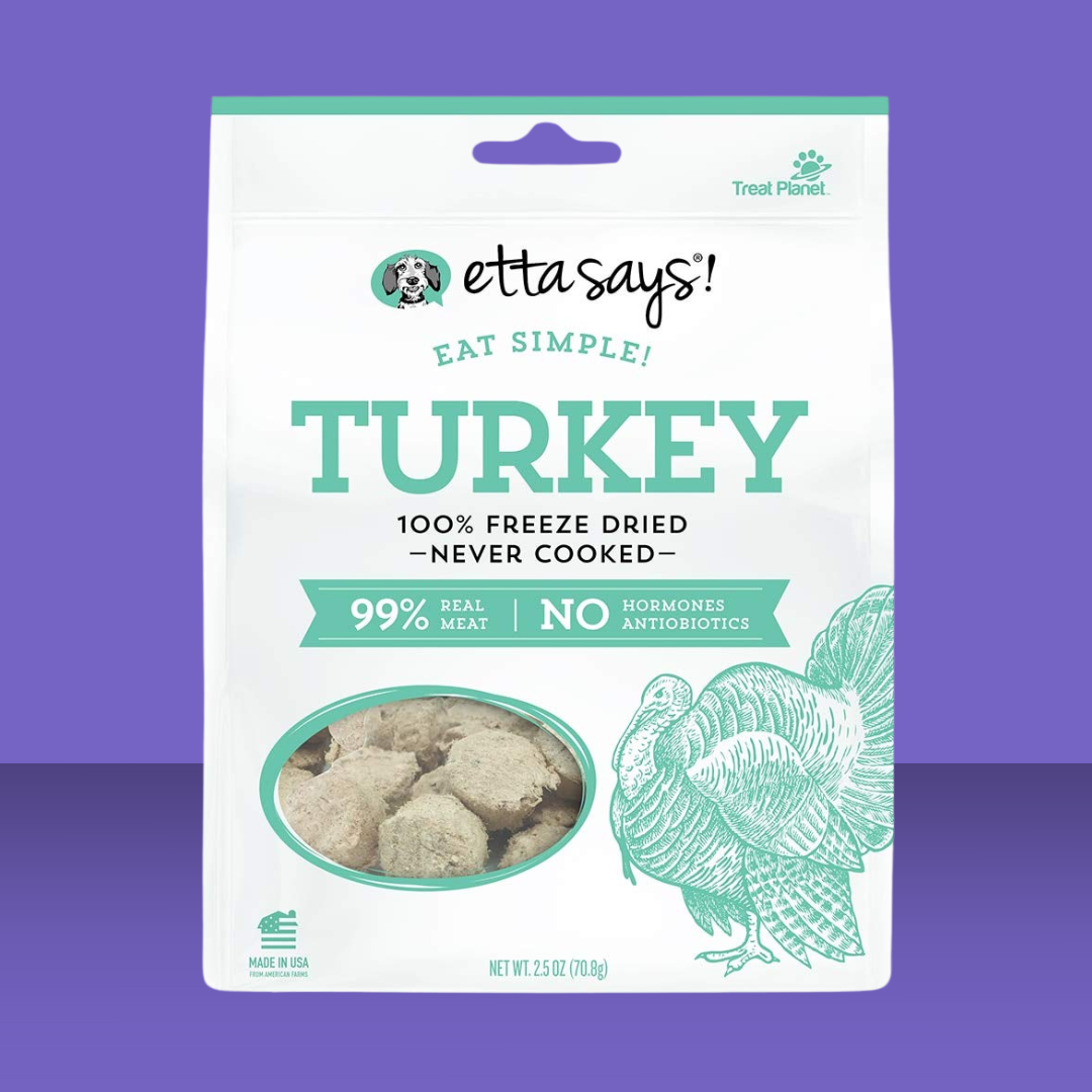 Your pal wants one thing in his snack—simple, delicious protein! Etta Says Eat Simple Freeze-Dried Turkey Dog Treats provide your pooch with a turkey-forward, protein-packed treat. This meat treat is freeze-dried—never cooked—for maximum flavor, and contains protein sourced from American farms. Made without the use of added hormones, antibiotics, fillers or grains, it’s an all-natural, super-tasty treat your pup will adore!