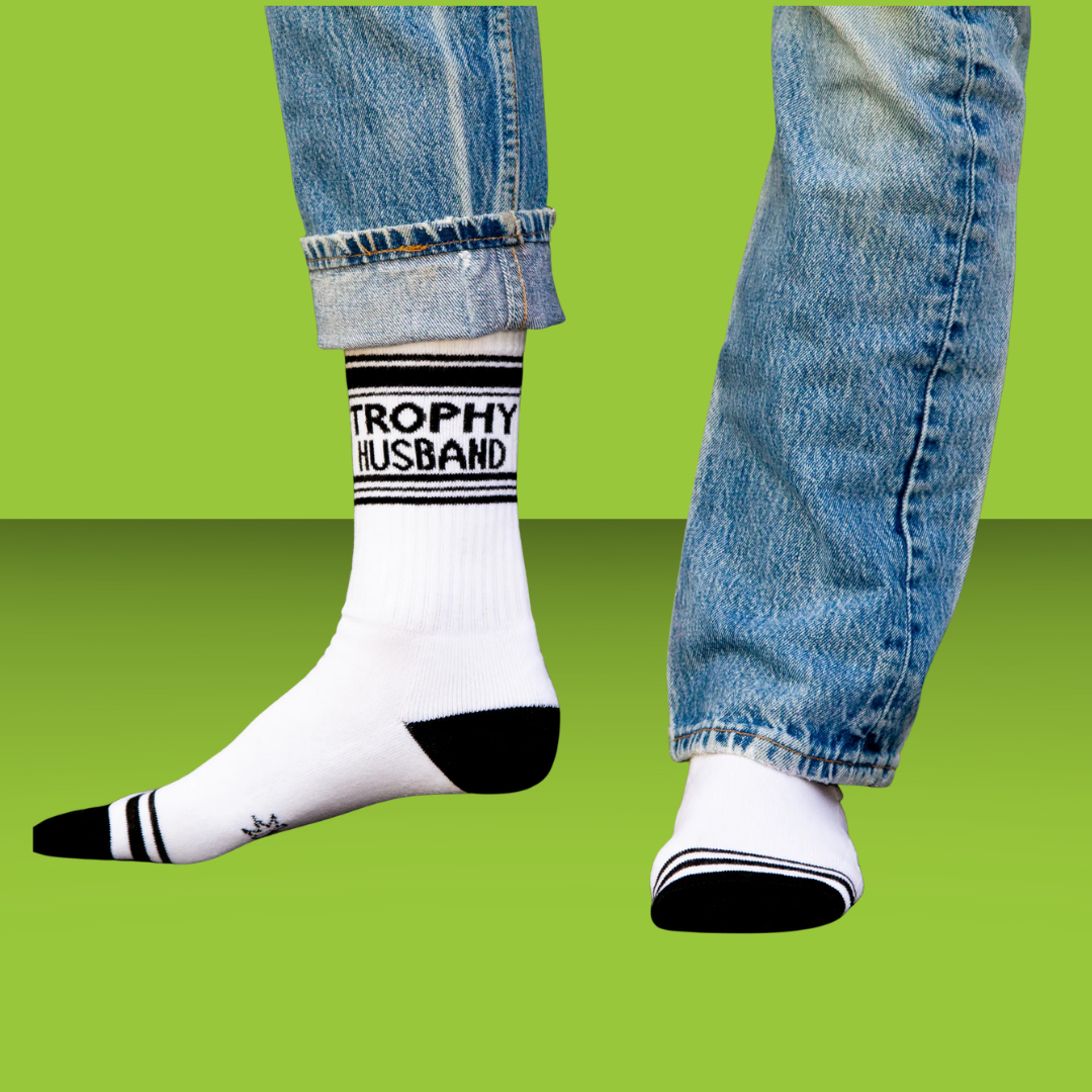 These super-comfy, unisex, one-size-fits-most, gym socks are made in the USA. These wide ribbed socks reach to mid-calf on most folks and fit a women’s size 6 US to men’s size 15. As a thicker weave, these socks are optimally worn with sneakers and other roomy shoe styles.
