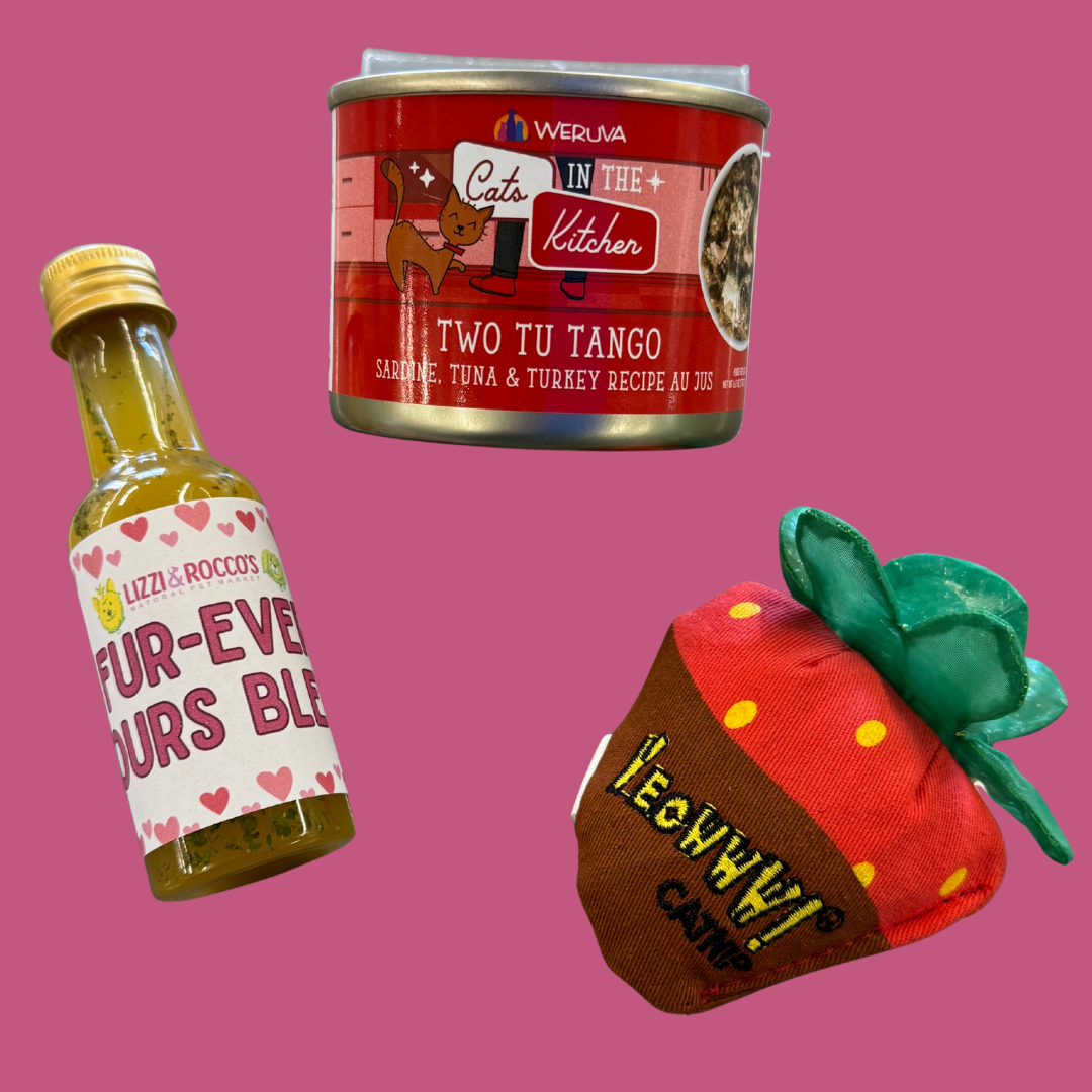 We think your kitty deserves a date night too! This Valentine’s Day Dinner features a gourmet can of Cats in the Kitchen Two Tu Tango (sardine, tuna & turkey in luscious au jus), paired with a chocolate-covered strawberry catnip toy from Yeowww! and a bottle of cat “wine” (beef bone broth). We're sure it'll get your favorite feline valentine to slow blink in your direction.