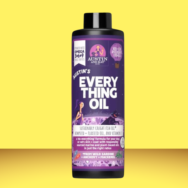 Improve your pet's overall health with Austin & Kat Everything Oil 16oz. This 'do-everything' formula promotes radiant skin and lustrous coat. Made from sustainably caught wild fish and organic hemp seed oil, this Omega 3/6/9 blend delivers healthy fats in perfect ratios.