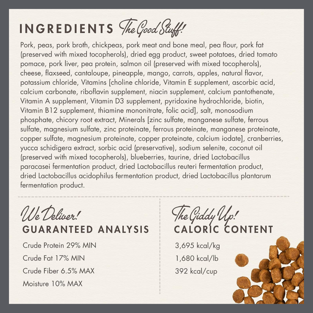 Pork, Peas, Pork Broth, Chickpeas, Pork Meat & Bone Meal, Pea Flour, Pork Fat (preserved with mixed tocopherols), Dried Egg Product, Sweet Potatoes, Dried Tomato Pomace, Pork Liver, Pea Protein, Salmon Oil (preserved with mixed tocopherols), Cheese, Flaxseed, Cantaloupe, Pineapple, Mango, Carrots, Apples, Natural Flavor, Vitamins [Potassium Chloride, Choline Chloride, Vitamin E Supplement, Ascorbic Acid, Calcium Carbonate, Riboflavin Supplement, Niacin Supplement, Calcium Pantothenate, Vitamin A Supplement, Vitamin D3 Supplement, Pyridoxine Hydrochloride, Biotin, Vitamin B12 Supplement, Thiamine Mononitrate, Folic Acid], Salt, Monosodium Phosphate, Chicory Root Extract, Minerals [Zinc Sulfate, Manganese Sulfate, Ferrous Sulfate, Magnesium Sulfate, Zinc Proteinate, Ferrous Proteinate, Manganese Proteinate, Copper Sulfate, Magnesium Proteinate, Copper Proteinate, Calcium Iodate], Cranberries, Yucca Schidigera Extract, Sorbic Acid (Preservative), Sodium Selenite, Coconut Oil (preserved with mixed tocopherols), Blueberries, Taurine, Dried Lactobacillus paracasei Fermentation Product,Dried Lactobacillus reuteri Fermentation Product, Dried Lactobacillus acidophilus Fermentation Product, Dried Lactobacillus plantarum Fermentation Product