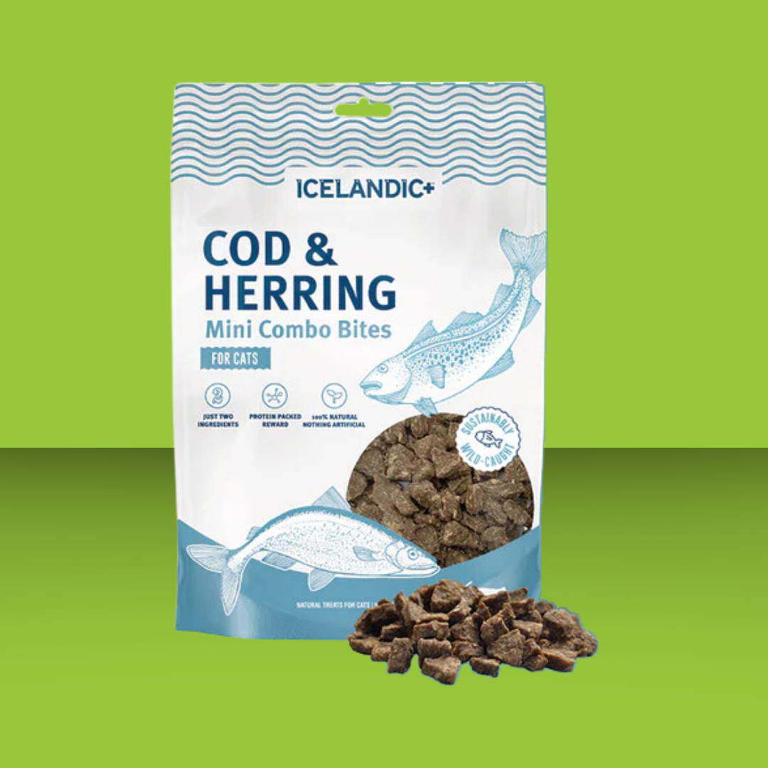 Elevate your cat’s snacking experience with Icelandic Mini Combo Bites, a deliciously crunchy, healthy treat made from just two ingredients - wild-caught cod & salmon. These bites are more than just a tasty delight—they’re a powerhouse of nutrition! Bursting with high-quality protein and rich in omega-3 fatty acids, they support your cat's brain function, eye health, and skin & coat vitality. Meow!