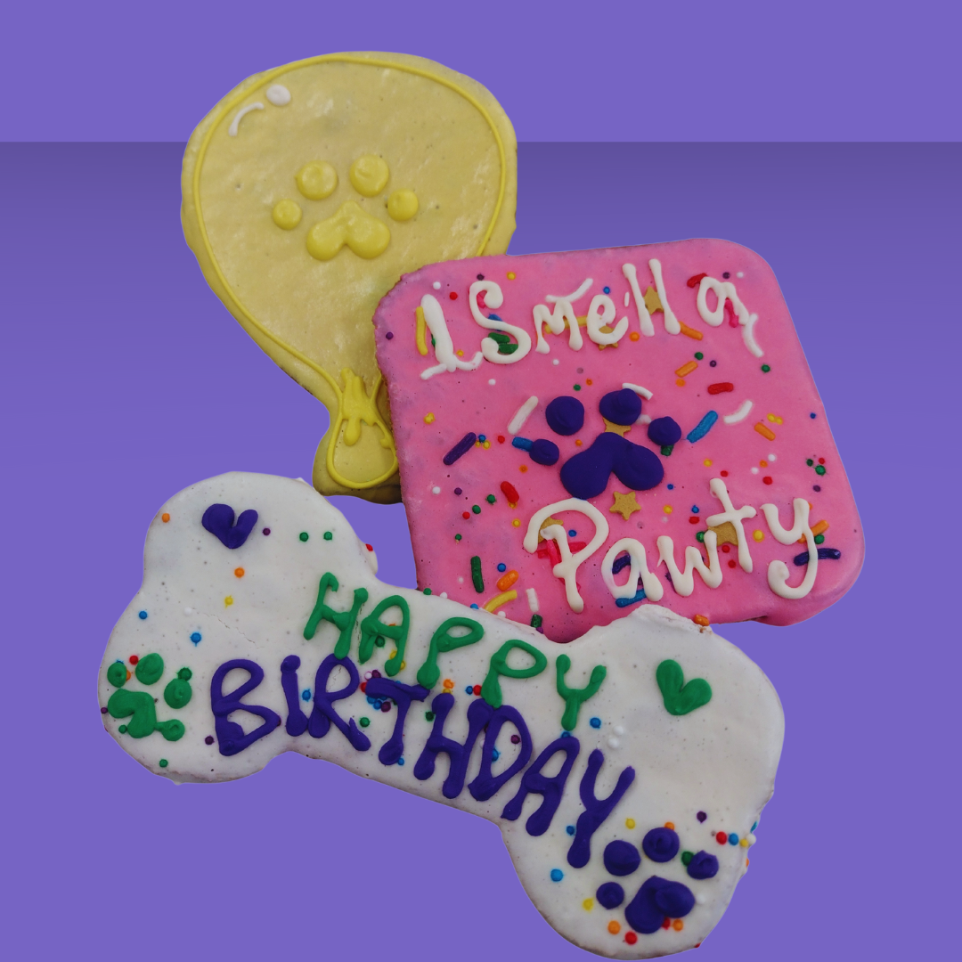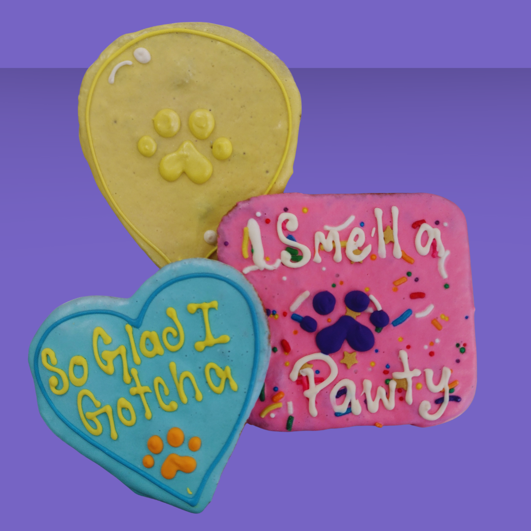 These cookies are the pawfect touch for your pup's special day! These crunchy cinnamon cookies are topped with delicious yogurt-based icing, delicious flavors sure to make tails wag. Each cookie is decorated with love by our bakery team at our South location, and they're always innovating- colors and styles may vary.