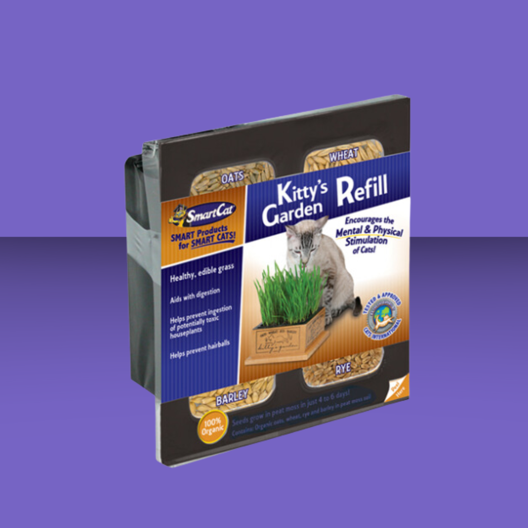 The Garden Box Refill includes USA Grown Oats, Wheat, Rye and Barley! Eating grass can help with digestion, prevent hairballs, and distract you kitty from potentially toxic houseplants. This is just the refill- if used on its own, the lightweight dish will flip over, so definitely use with the Smart Cat Kitty's Garden Wood Box!