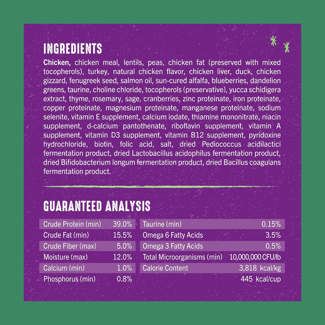 Cage-Free Chicken, Chicken Meal, Lentils, Peas, Chicken Fat (preserved with Mixed Tocopherols), Cage-Free Turkey, Natural Chicken Flavor, Chicken Liver, Cage-Free Duck, Chicken Gizzard, Fenugreek Seed, Salmon Oil (Preserved with Mixed Tocopherols), Suncured Alfalfa, Organic Blueberries, Dandelion Greens, Taurine, Choline Chloride, Mixed Tocopherols (preservative), Yucca Schidigera Extract, Thyme, Rosemary, Sage, Organic Cranberries, Zinc Proteinate, Iron Proteinate, Copper Proteinate, Magnesium Proteinate, Manganese Proteinate, Sodium Selenite, Vitamin E Supplement, Calcium Iodate, Thiamine Mononitrate, Niacin Supplement, D-calcium Pantothenate, Riboflavin Supplement, Vitamin A Supplement, Vitamin D3 Supplement, Vitamin B12 Supplement, Pyridoxine Hydrochloride, Biotin, Folic Acid, Salt, Dried Pediococcus Acidilactici fermentation product, Dried Lactobacillus Acidophilus fermentation product, Dried Bifidobacterium Longum fermentation product, Dried Bacillus Coagulans fermentation product